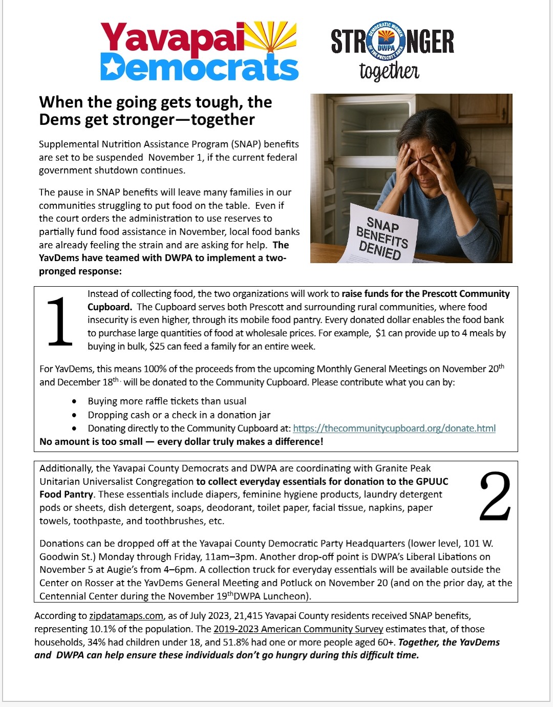 Our ongoing mission is to inspire and empower Democrats in Yavapai County, Arizona, and to elect Democrats to public office at every level of government.